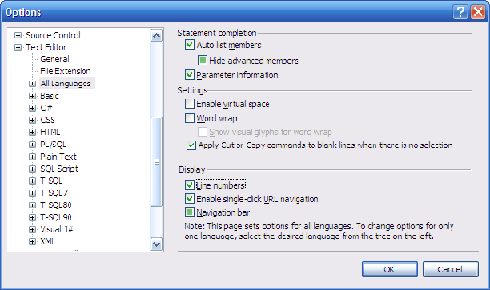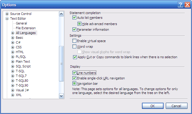 There you can choose the All languages node or the node of the language that you’re interested in and check the Line numbers checkbox. Click the OK button and you have the line numbers appearing in your source view.