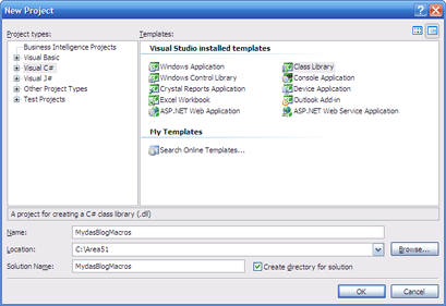 So, as I already mentioned, creating macros is just like creating a class library. So lets fire up vs.net, create a new project and in the templates choose Class library like in Figure 1. The name of the project is also important when we will be configuring dasBlog to let it know about the existence of our macros. I chose MydasBlogMacros but you can choose your own name of course.