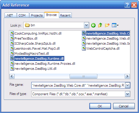 Figure 3: Navigate to the bin folder of the compiled bits of dasBlog and select the needed assemblies.