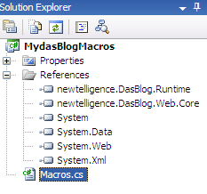 Now we have to add 3 references in order to be able to create our custom macro. You do this by right clicking in the Solution Explorer of Visual Studio.NET on the References node. Take a look at Figure 2 to choose System.Web, and Figure 3 to choose 2 assemblies that are from dasBlog itself. These 2 are newTelligence.DasBlog.Runtime and newTelligence.DasBlog.Web.Core. The result is shown in Figure 4.