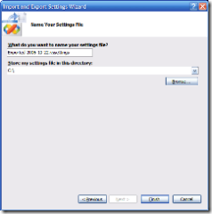 Check all the settings you want to export and choose Next. In the next step you can provide the location and name for the exported settings: