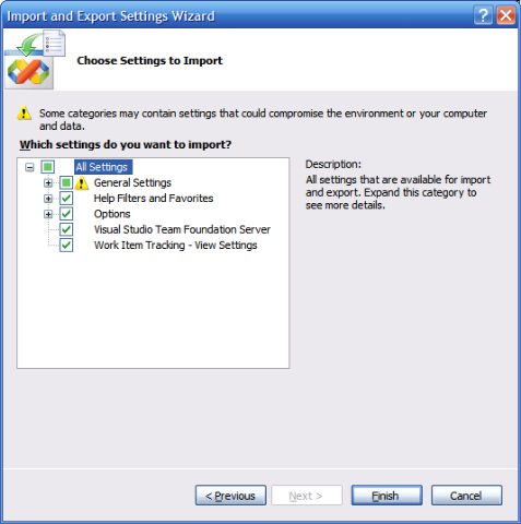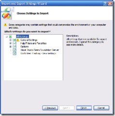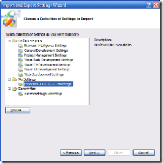 After that you choose Finish and let Visual Studio 2005 import the settings.