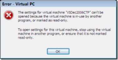 For a course I’m going to follow, starting tomorrow, I needed VPC to run on my laptop. Unfortunately my old VPC software didn’t run but one can obtain the beta of VPC 2007. Just installing that and trying to add an existing vpc image gave this error: