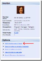If you’re a member reading this you can enable it by clicking on the Edit Profile button in the right upper corner, navigate to the Favorites tab and check the Share Friends checkbox and hit save at the bottom of that page. After that it’s easy to add friends by going to their public profile of a member you see on the forums or, if you know their nickname, navigate directly to http://forums.asp.net/members/nickname.aspx. So for me that becomes http://forums.asp.net/members/XIII.aspx.