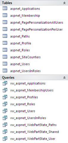 These are the files I got after extracting the .zip file. You see there’s already a full blown ASPNetDB.mdb file in it that has the needed tables and queries to be able to support the Application Services. Figure 2 shows what’s already available. As you can see