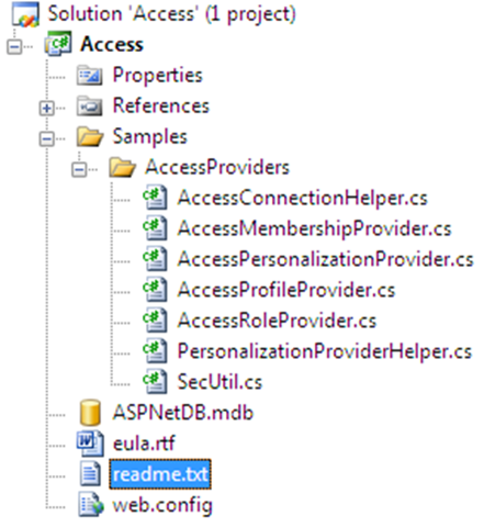 After extracting the files we still need to compile the source code in order to be able to integrate the providers into our web application. If you have Visual Studio or Visual C# Express installed you open your IDE of choice. You navigate to the menu and click File, Open, Project/Solution. Once the dialog opens you navigate to where you extracted the contents of the zip file. Select the Access.csproj, see Figure 1, and click the Open button.