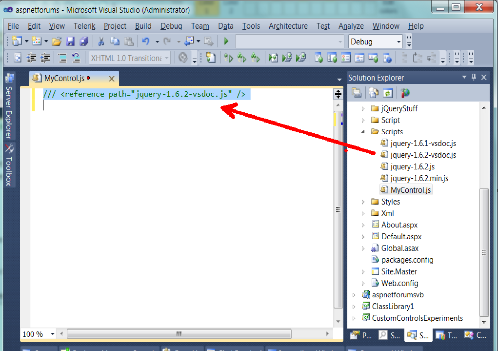 You have a nice -vsdoc.js file sitting in your solution explorer and are used to get that great Intellisense kicking in when you work inside a webpage or webform doing some cool ASP.NET coding.