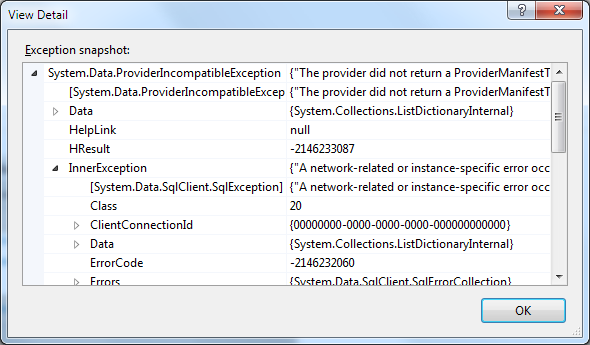 Well, what I could’ve done is trying to fiddle around with settings of SQL Server, trying to get it right and working. However I noticed that Entity Framework was being used and in the code I found this little piece: