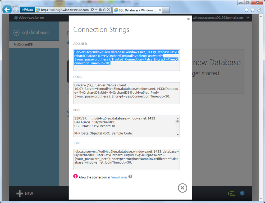If you want you can connect to your database server and open the MyOrchardDB database. Be sure however to add the IP address you’re using at this moment in the firewall rules or else you won’t be able to connect to it. The portal will provide a warning and an option to directly add your current IP address to the allowed list which is a nice feature.