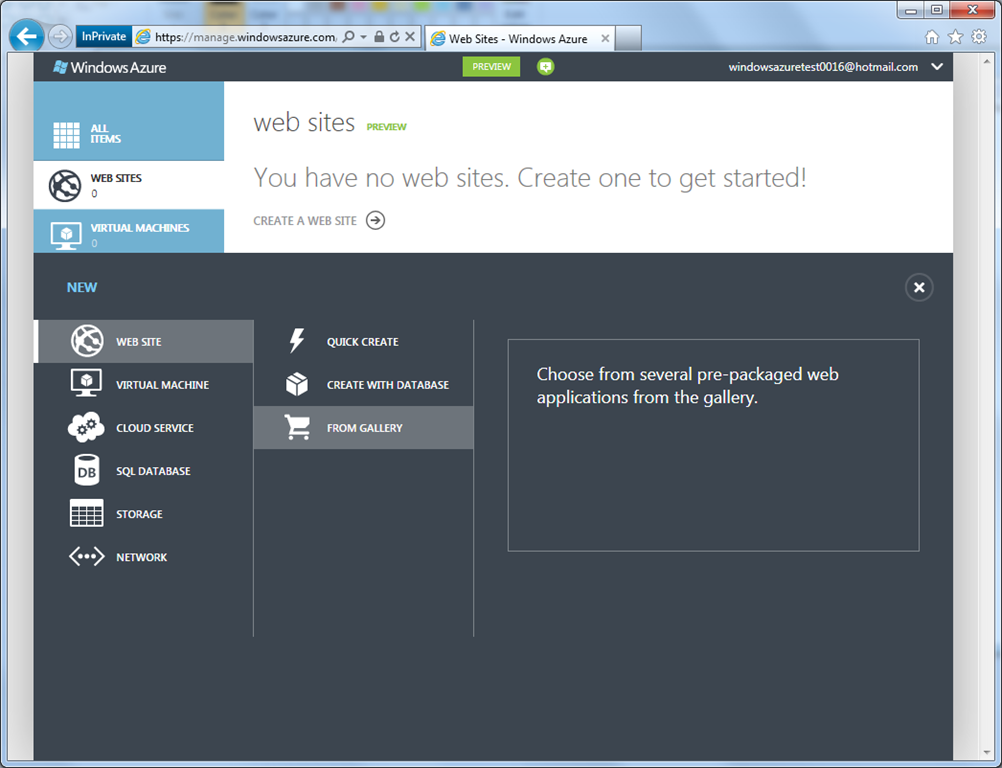 Either make use of the big + sign in the lower left of the portal or click on CREATE A WEB SITE from the WEB SITES menu item in the portal. Select the FROM GALLERY and in there select Orchard CMS:
