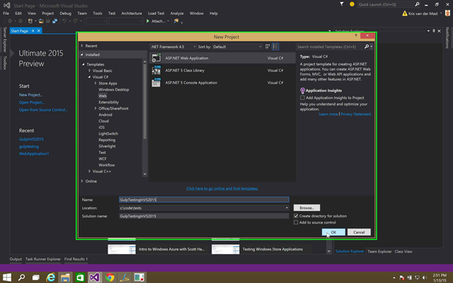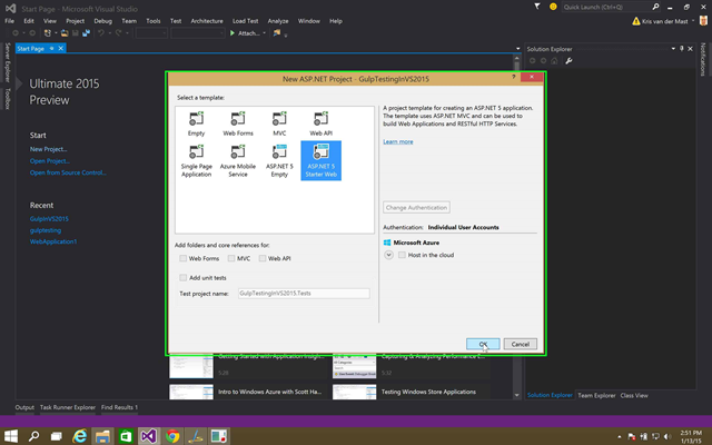 Give it a meaningful name and press OK and opt in the following screen for ASP.NET 5 Starter Web