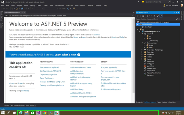 I’ve been fiddling around lately with Gulp and Bower. 2 tools that go hand in hand to make compelling web applications and… also integrate nicely in the new Visual Studio.