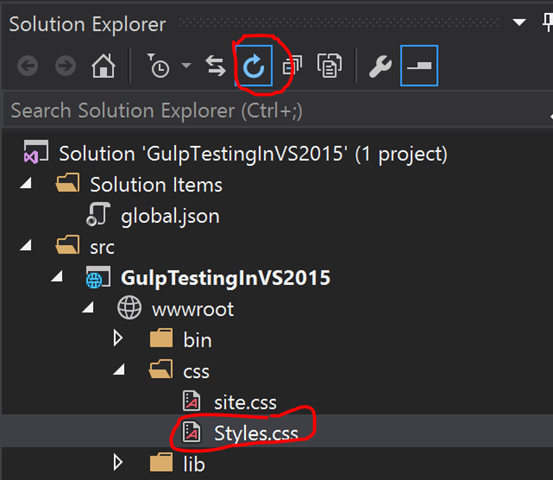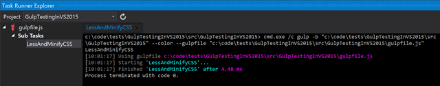 What goes on in this gulp file is that first declarations are made for the packages we’re going to make use of in our function. Then a Gulp task is created with the name LessAndMinifyCSS. We’ll also see, after a refresh, that function name appear in the Task Runner Explorer.