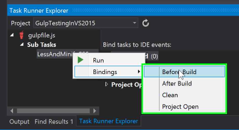 Now in the Task Runner Explorer right click the LessAndMinifyCSS task. Click the Bindings menu item and then select Before Build.