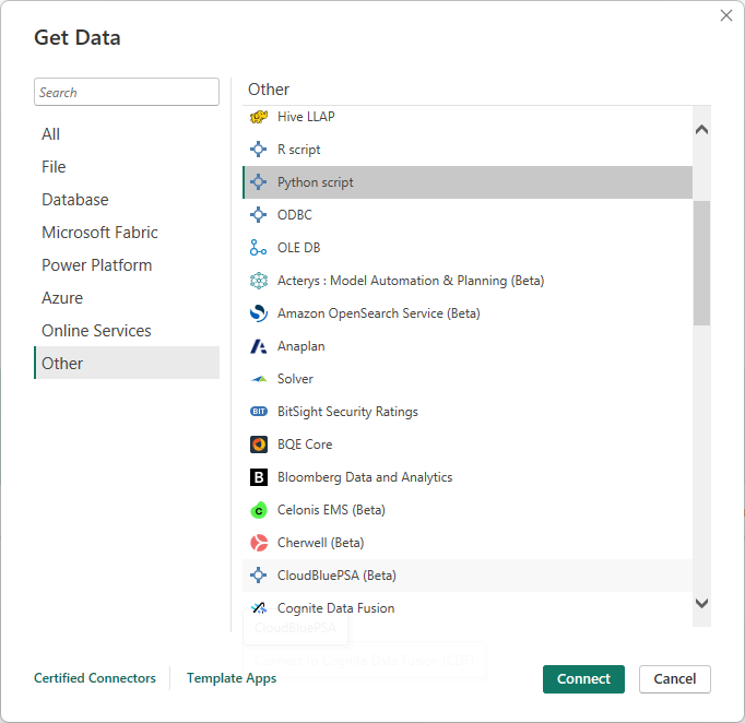 After creating a new reportin Power BI, check if the virtual environment is set up correctly as per the former blog post. If so select Get datasource > More... > Other > Python script and click Connect.
