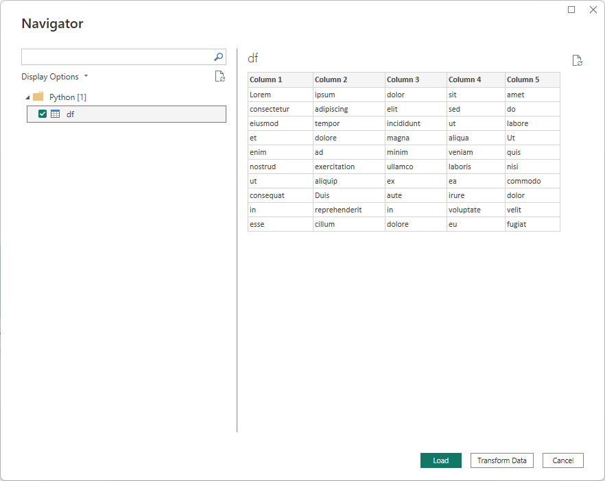Source = Python.Execute("import pandas as pd#(lf)#(lf)data = [#(lf) ['Lorem', 'ipsum', 'dolor', 'sit', 'amet'],#(lf) ['consectetur', 'adipiscing', 'elit', 'sed', 'do'],#(lf) ['eiusmod', 'tempor', 'incididunt', 'ut', 'labore'],#(lf) ['et', 'dolore', 'magna', 'aliqua', 'Ut'],#(lf) ['enim', 'ad', 'minim', 'veniam', 'quis'],#(lf) ['nostrud', 'exercitation', 'ullamco', 'laboris', 'nisi'],#(lf) ['ut', 'aliquip', 'ex', 'ea', 'commodo'],#(lf) ['consequat', 'Duis', 'aute', 'irure', 'dolor'],#(lf) ['in', 'reprehenderit', 'in', 'voluptate', 'velit'],#(lf) ['esse', 'cillum', 'dolore', 'eu', 'fugiat']#(lf)]#(lf)#(lf)df = pd.DataFrame(data, columns=['Column 1', 'Column 2', 'Column 3', 'Column 4', 'Column 5'])"),